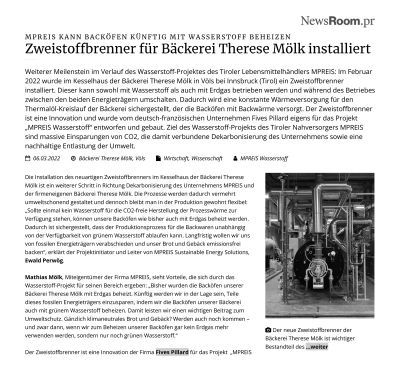 Weiterer Meilenstein im Verlauf des Wasserstoff-Projektes des Tiroler Lebensmittelhändlers MPREIS: Im Februar 2022 wurde im Kesselhaus der Bäckerei Therese Mölk in Völs bei Innsbruck (Tirol) ein Zweistoffbrenner installiert.